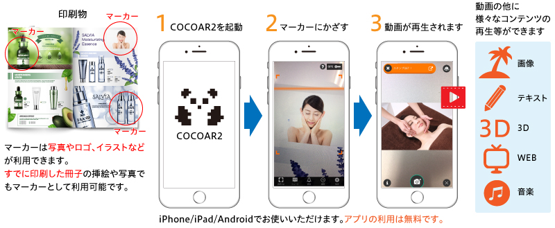 スマホアプリ「COCOAR」を起動し、カメラをかざしてスキャンする対象の画像をマーカーと呼んでいます。マーカーはカタログやパンフレット、ポスター、名刺などに印刷した写真やイラスト、ロゴマークなどが登録可能です。
