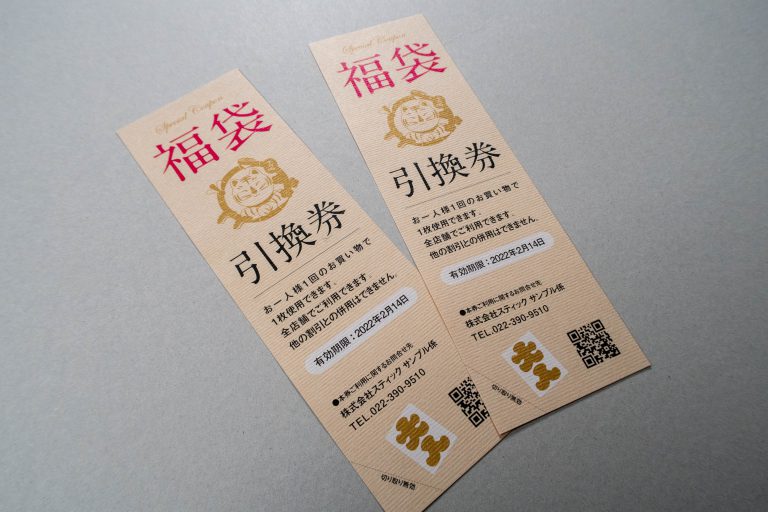 最近ですと、密を避ける対策として事前にチケットを配ったりといった用途でチケット印刷が人気です。これからの時期だと、お正月の福袋配布に交換券などもどうでしょうか?